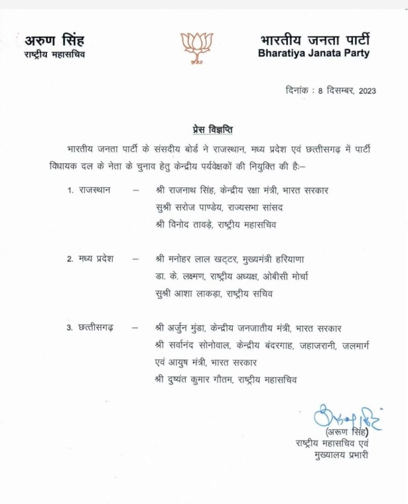 रायपुर। भारतीय जनता पार्टी के संसदीय बोर्ड ने छत्तीसगढ़ में पार्टी विधायक दल के नेता यानी मुख्यमंत्री के चुनाव के लिए तीन सदस्यीय केंद्रीय पर्यवेक्षकों की नियुक्ति की है। पर्यवेक्षक ही छत्तीसगढ़ के नए विधायक दल के नेता का चुनाव करेंगे। छत्तीसगढ़ के नए सीएम कौन होगा यह तीन लोग ही डिसाइड करेंगे।